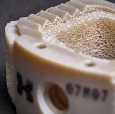- A fully interconnected 3D porous architecture, mimicking the structure of trabecular bone, allowing for vascularization and osteoblast infiltration.