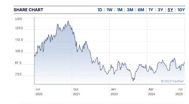 In recent years, Medtronic’s stock has shown mixed performance. According to the attached chart, the share price has experienced significant fluctuations, reaching a peak of around $125 at some point before 2020, followed by a decline to levels near $75 in later periods. Currently, the stock is trading at $89.92 (Yahoo Finance, July 11, 2025), reflecting a moderate recovery but still below its all-time highs.
