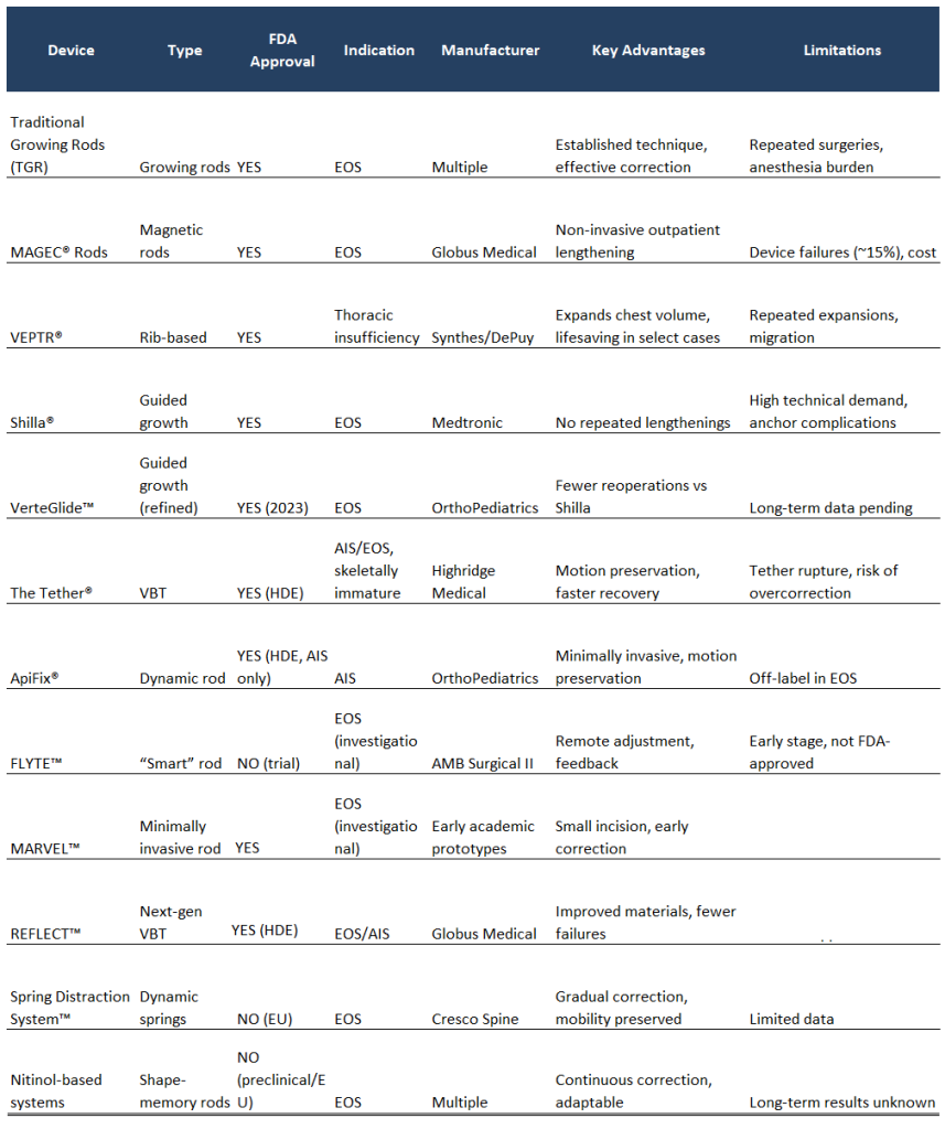 - ApiFix® (OrthoPediatrics): Approved under HDE in 2019, but strictly for adolescent idiopathic scoliosis (AIS). Its use in EOS remains off-label and investigational.