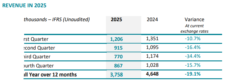 SpineGuard’s consolidated revenue amounted to €3,758K for the full year 2025, down 19% at current exchange rates (-17% at constant exchange rates) compared to 2024.