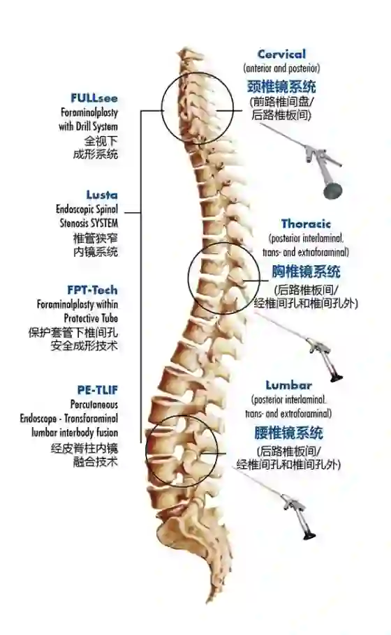 The Endoscope system of Spinendos could meet the whole spine segments clinical needs. Except the endoscope system Spinendos have the bipolar radiofrequency induced ablation system, image system, and power system for support the new clinical spinal technique.
