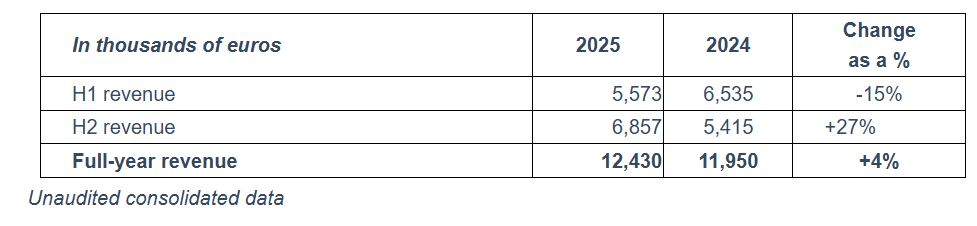 In the final quarter of 2025, Spineway, a specialist in innovative implants for the treatment of severe spine disorders, benefited from an acceleration in sales across all of its markets and the receipt of key account orders deferred from the first half of the year. With revenue of €3.8 million, up 34% compared with Q4 2024 (€2.8 million), Spineway recorded a particularly dynamic fourth quarter.